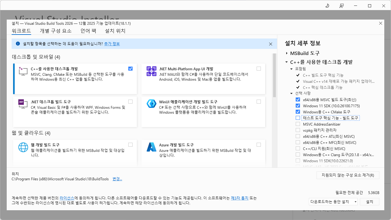 ✅ 1️⃣ Visual Studio Build Tools 설치 (정공법, 가장 확실) 이미 Visual Studio가 있어도, C++ 빌드 도구가 없으면 실패함 설치 방법 아래 공식 링크 접속 👉 https://visualstudio.microsoft.com/visual-cpp-build-tools/ 실행 후 워크로드 선택 ☑ C++ 빌드 도구 ☑ MSVC v14.x ☑ Windows 10/11 SDK 설치 완료 후 pip install 라이브러리명 📌 이러면 vswhere.exe도 자동으로 깔림이런 적이 있었기 때문에 빠르게 설치함.